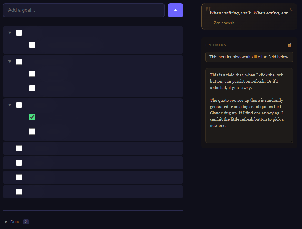 I often use pastebin to write out little to-do lists for the day, or keep track of goals. I decided it’d be nicer if whenever I opened a new tab in Chrome, I could immediately see my goals, and had a little text field to write stuff down. Within a few minutes, Claude Code achieved this for me.