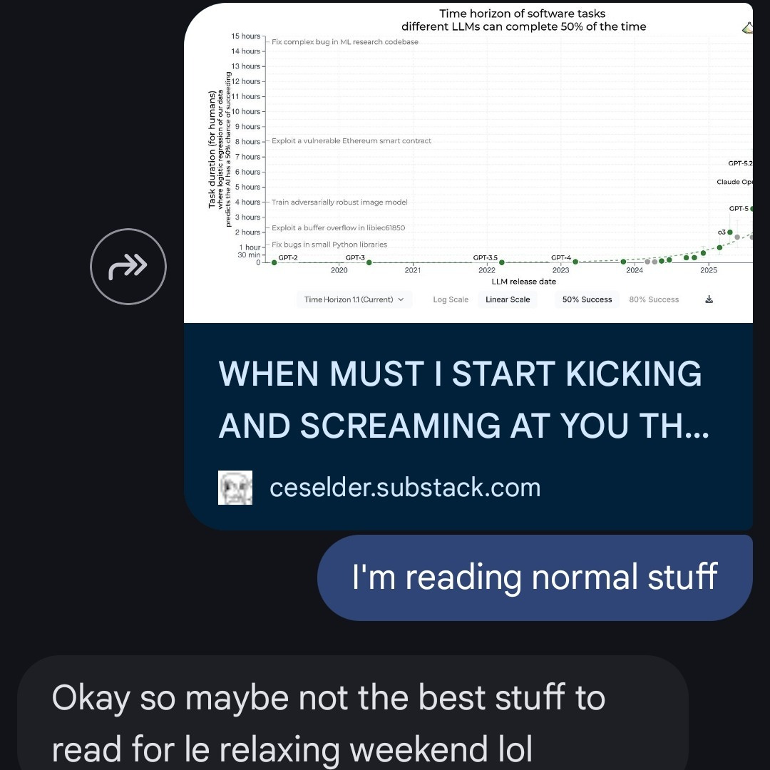 So the opportunity cost of just kind of vibing, or gaming, or whatever, feels much higher than it used to. I could play around with Claude Code, which feels kind of like a video game, and end up with an actual useful output. So why not just do that all the time? In every free moment? The obvious answer here is burnout, that rest is valuable in and of itself and directing a coding agent is tiring. So, okay, sure. Don’t do it all the time. But how much is correct, outside of work? An hour a day? Two hours a day? Fifteen minutes? There is no objective answer, and time bleeds by nonstop.