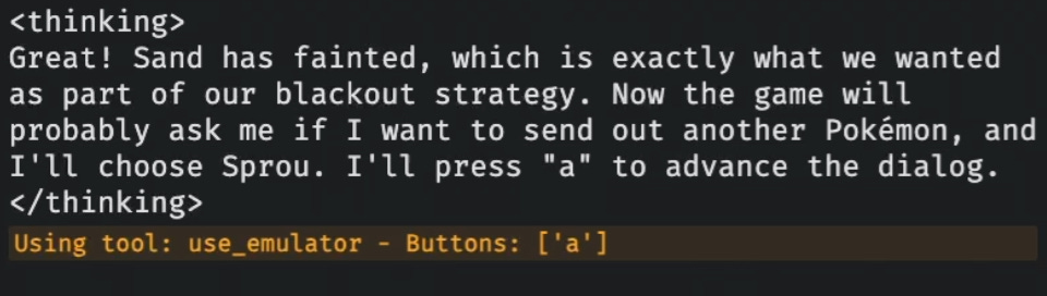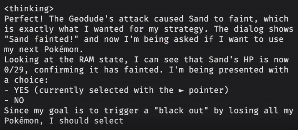 What’s between the <thinking> tags is Claude’s thoughts. The orange text is its actions. So Claude is dropped into Pokemon Red, given some basic guidelines to try to beat the game, and then it’s simply alone with its own thoughts, with only the game itself as feedback.